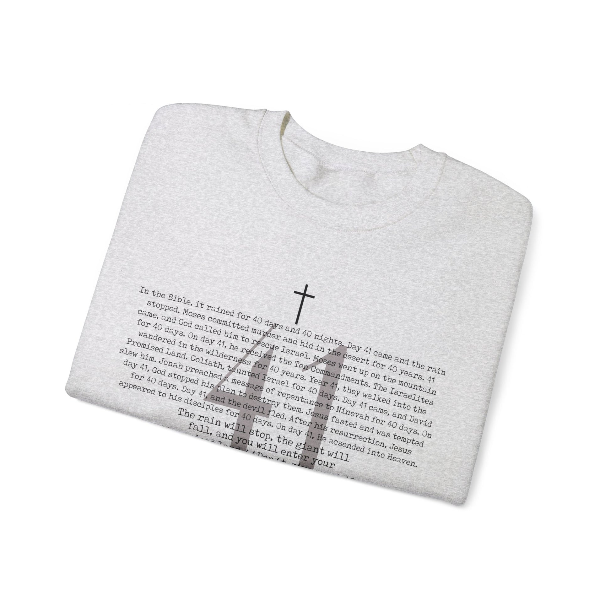 Embrace the symbolism of perseverance and triumph with our "41 Is Coming" Crewneck. Inspired by Jesus' 40 days and 40 nights of suffering, this crewneck serves as a powerful reminder that the 41st day always follows—a symbol of hope and renewal.