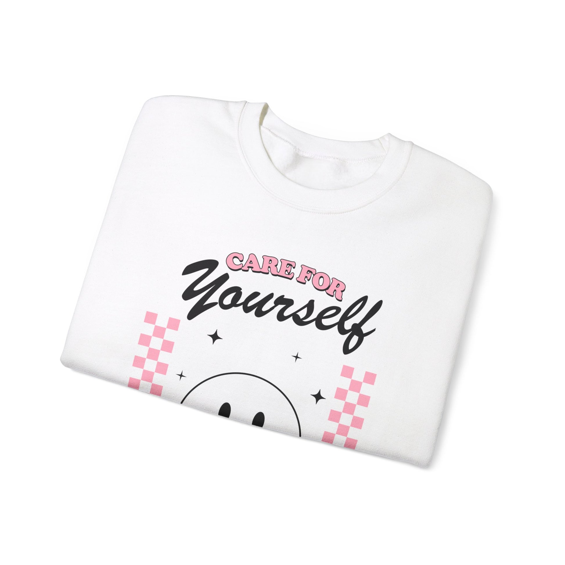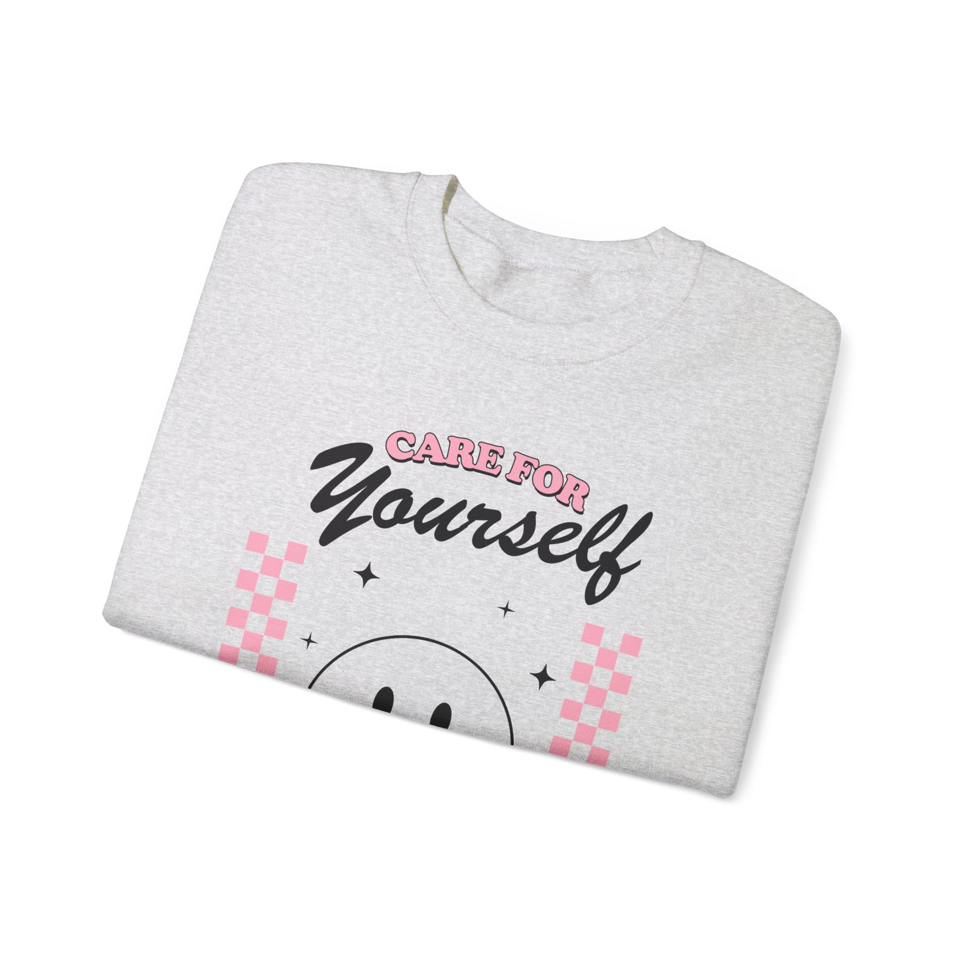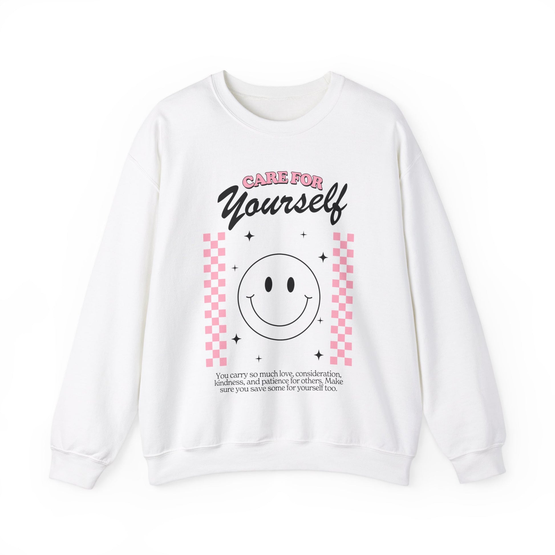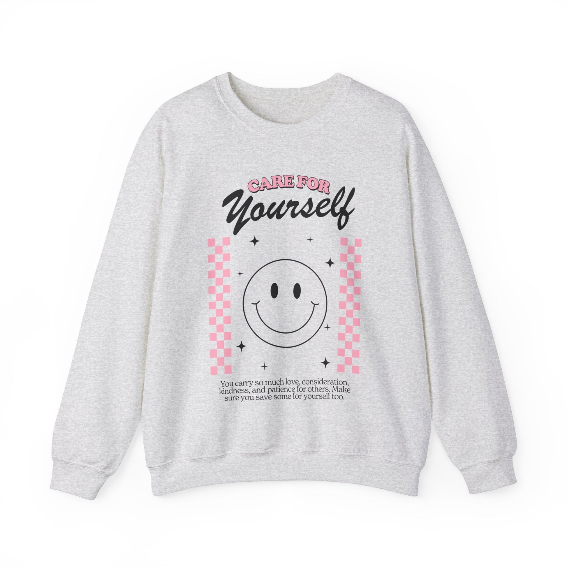 Embrace self-care and positivity with our "Care for Yourself" Crewneck. Featuring a cheerful smiley and an uplifting quote, this crewneck serves as a gentle reminder to prioritize your well-being and happiness.