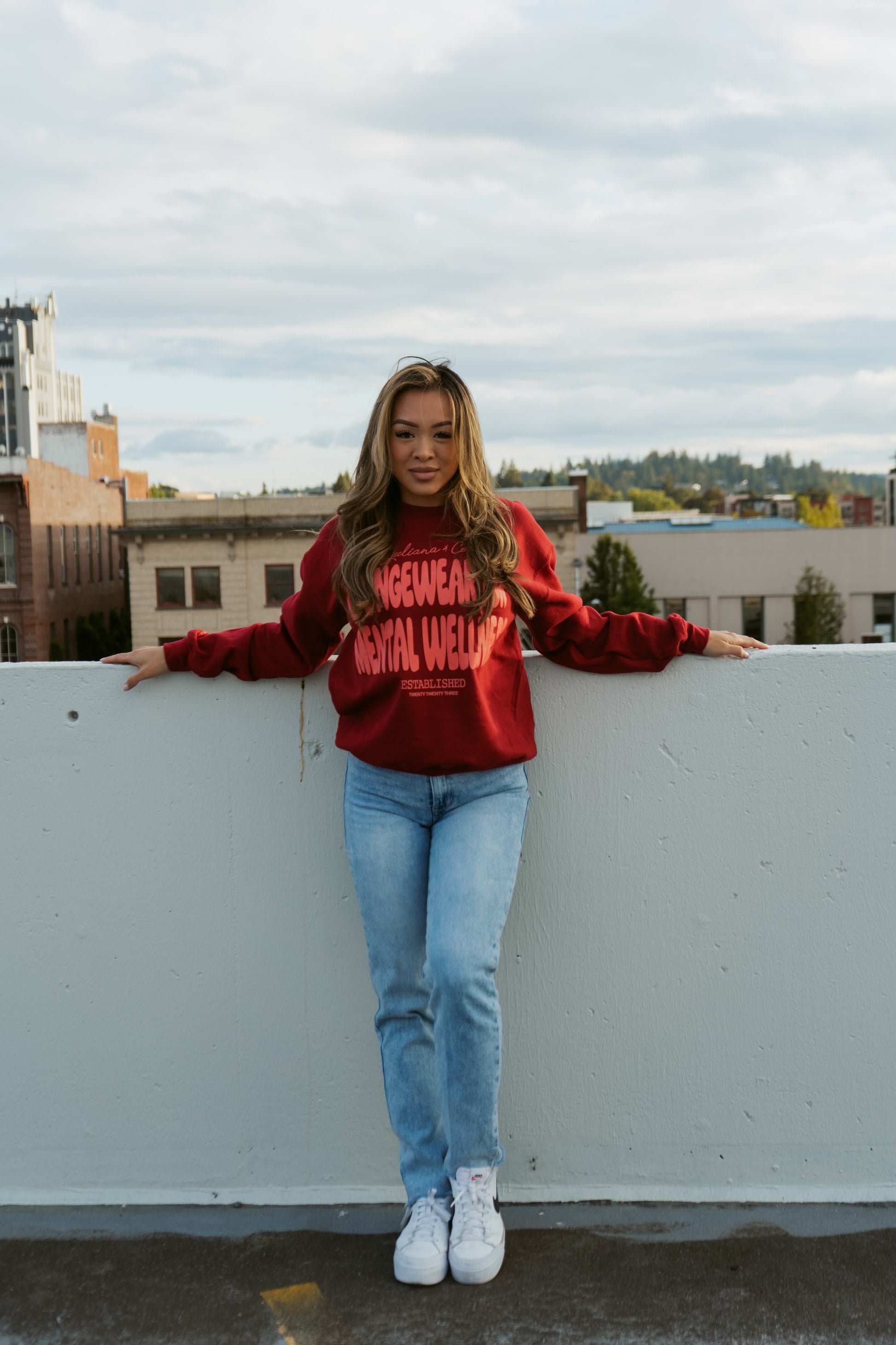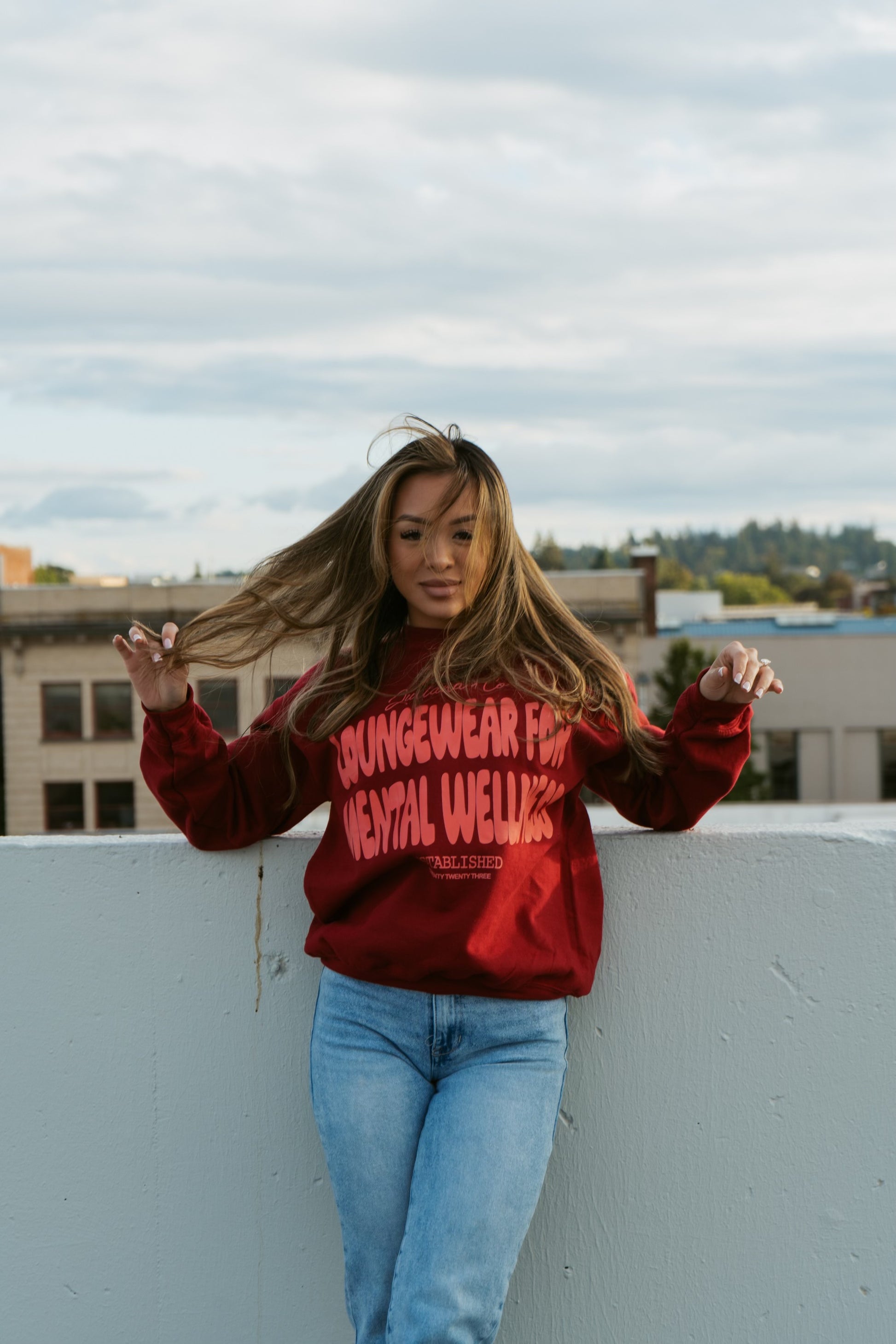 Introducing Cessy Ro's Tee, named after our girl Cessy Ro. This beautiful crimson tee features a coral lettering that proudly declares us as a mental wellness loungewear company. The sleeve displays our famous reminder, "I'm glad you're here", inspiring connection and positivity. True to size, but size up for an oversized fit. Ships in 14-21 days.