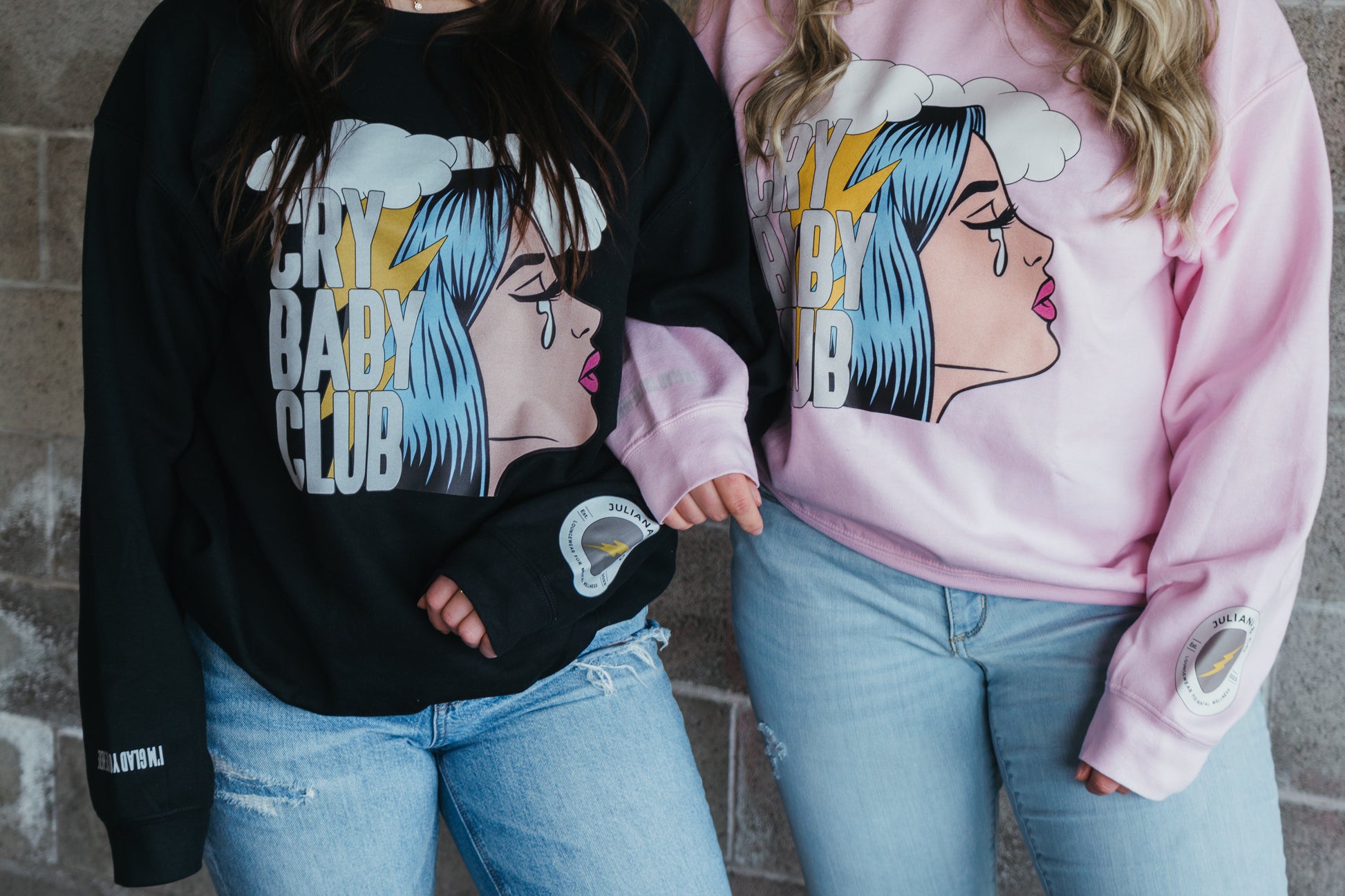 Not a hoodie gal? No problem! Cry Baby Club available in our favorite crew style, fit is true to size so go up a size or two for an oversized look. Featuring our signature "I'm Glad You're Here" on the sleeve to serve as your daily reminder.