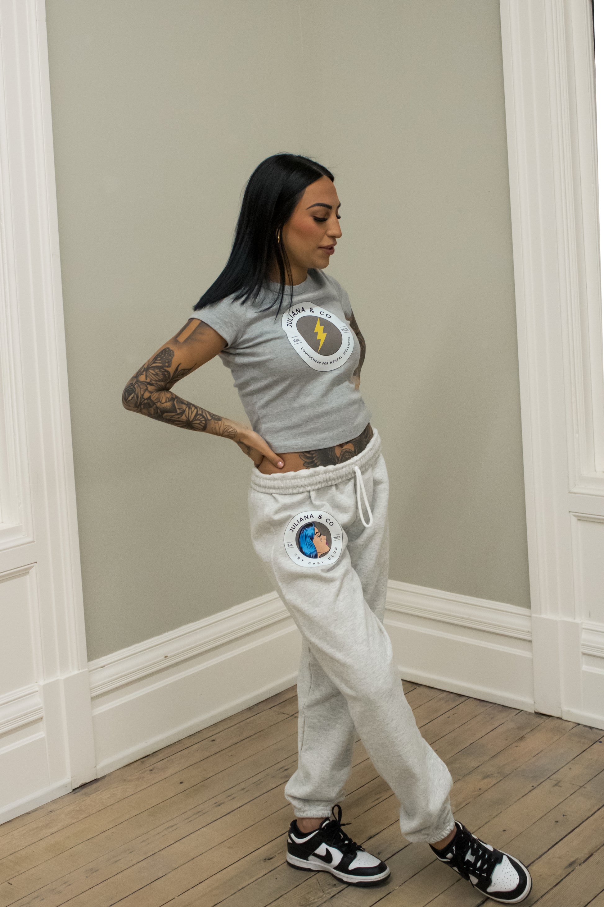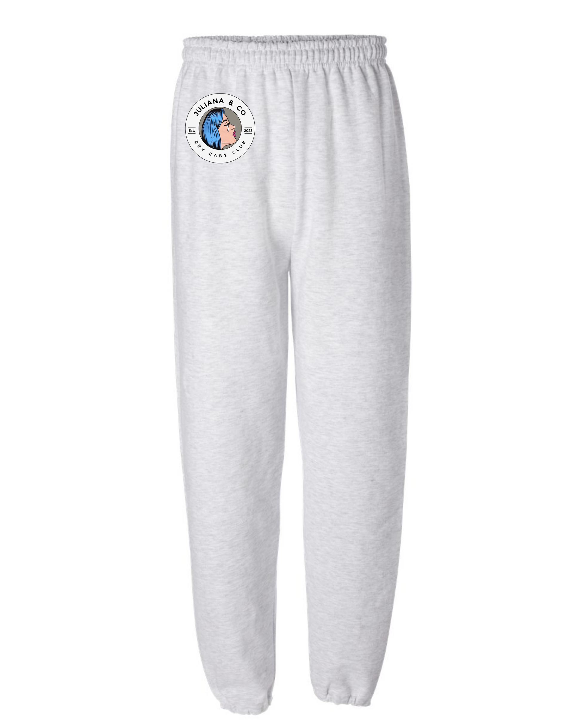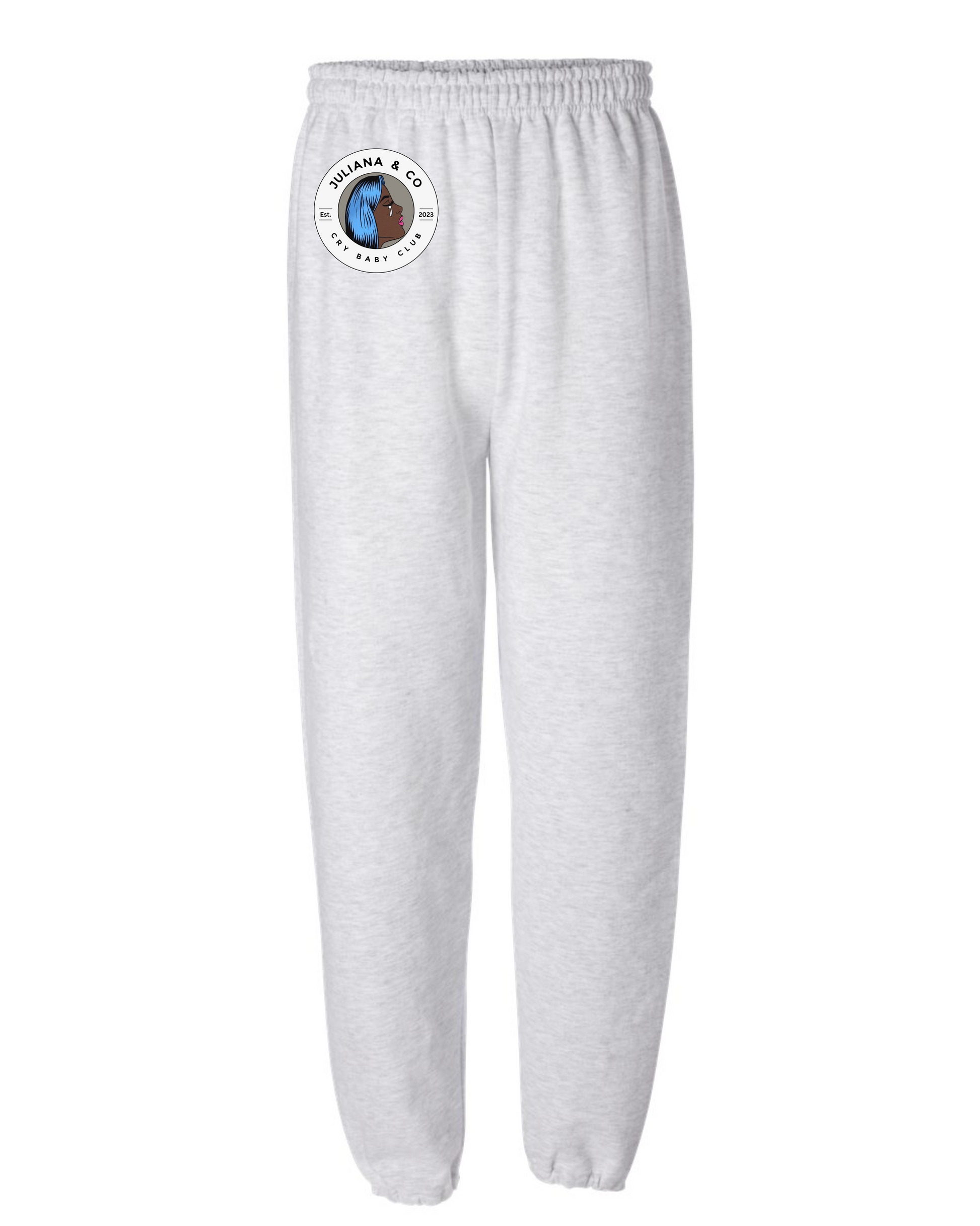 Material: 100% preshrunk cotton. Elastic waistband and cuffed ankles. Ash colored joggers.