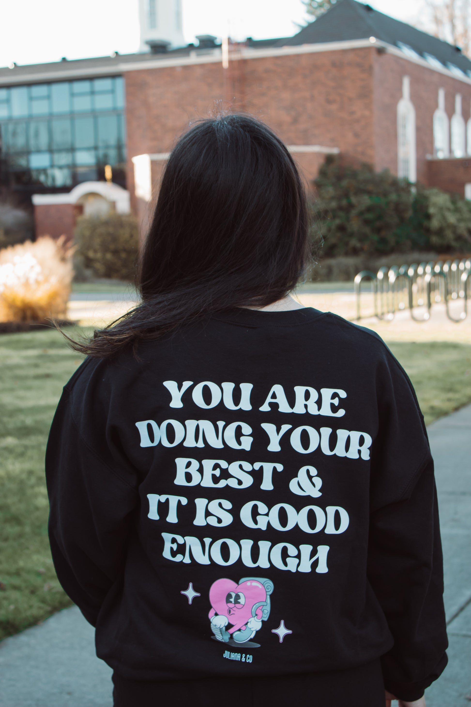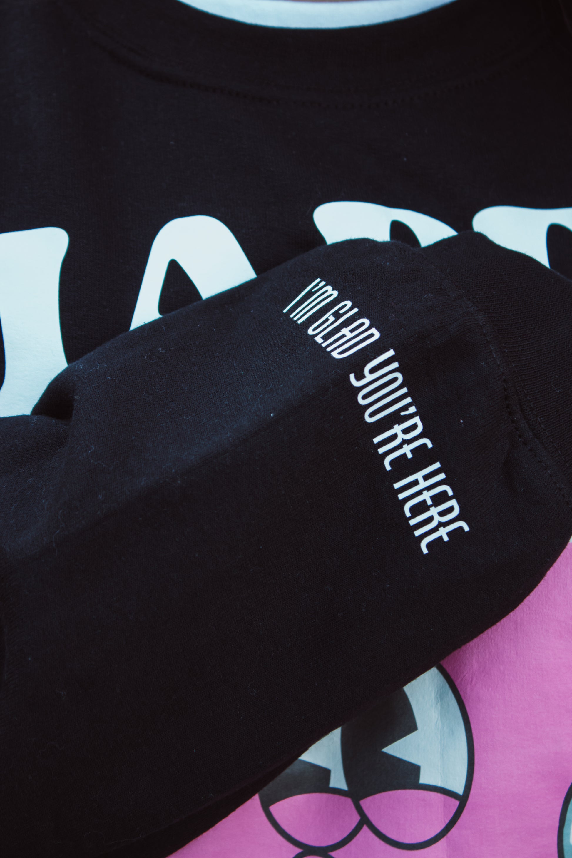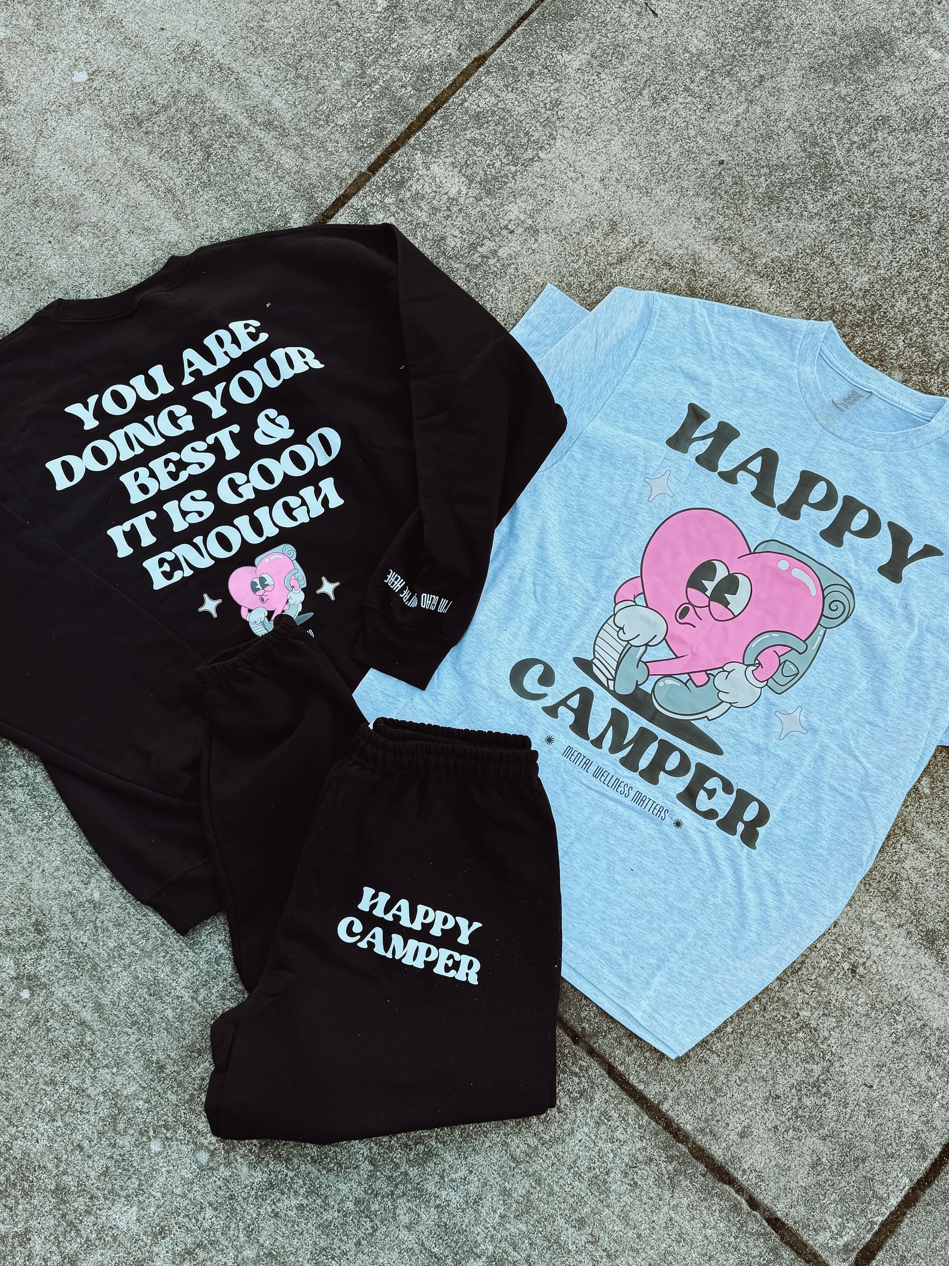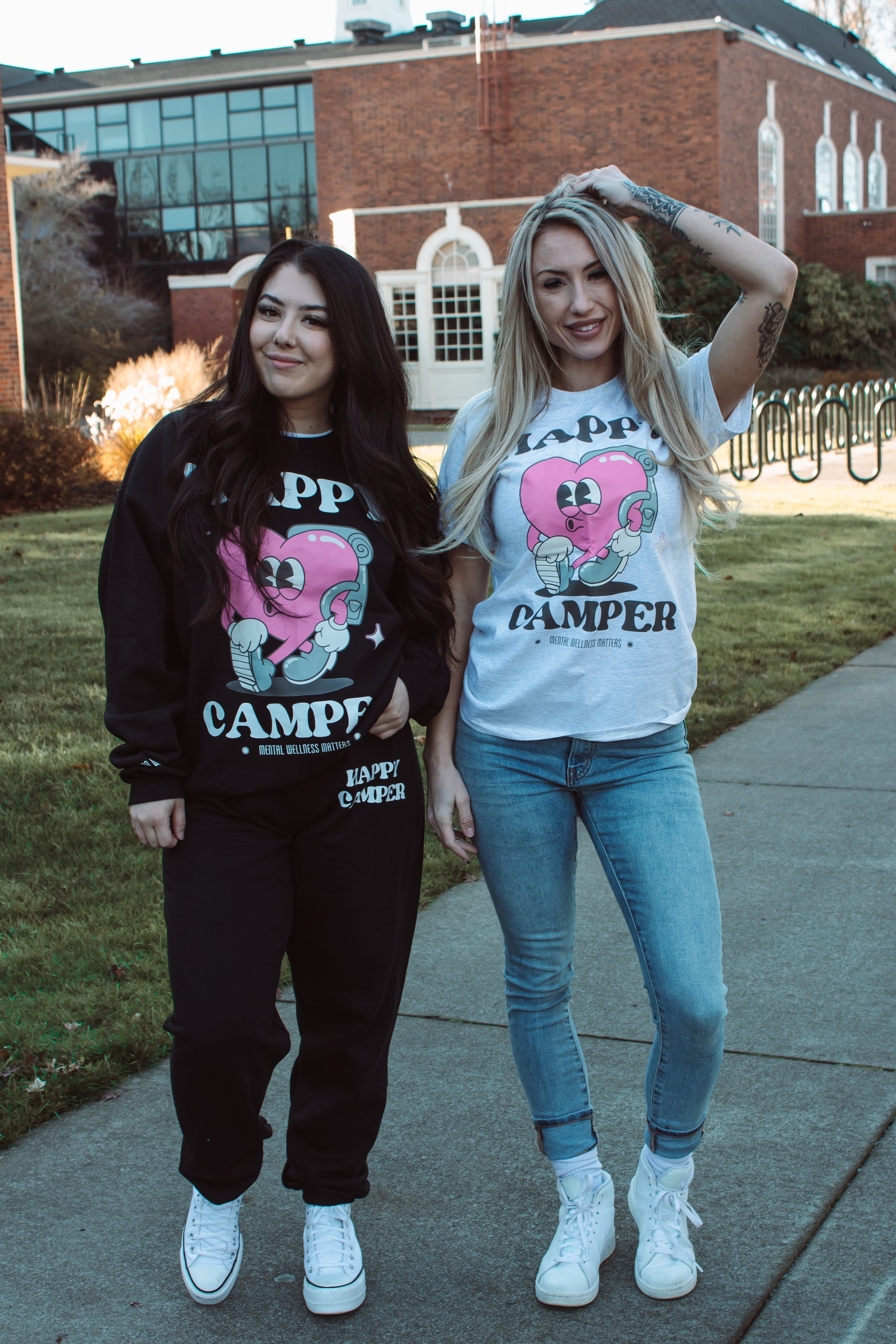 Happy Camper's know how much mental wellness matters. This graphic crewneck is a perfect way to show that! A special message is on the sleeve for you, "I'm glad you're here" as your daily reminder.