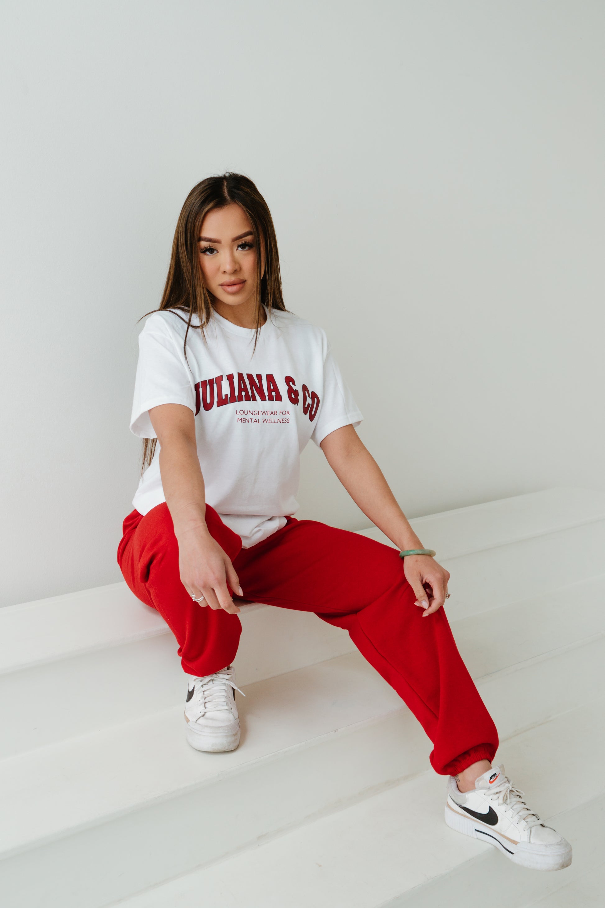 All the varsity feels with this set! The perfect university red that can be styled any way - dressed up or down! Pair it with the J's Varsity pieces to complete the full set.
